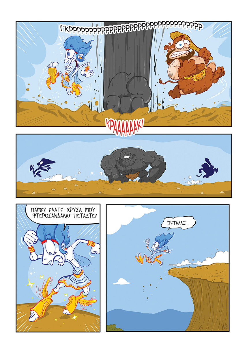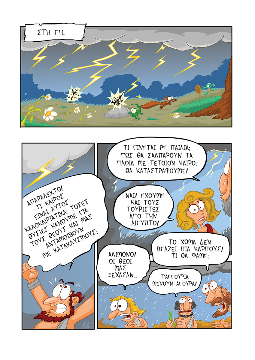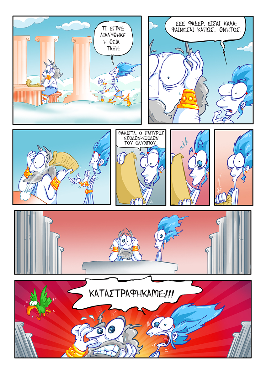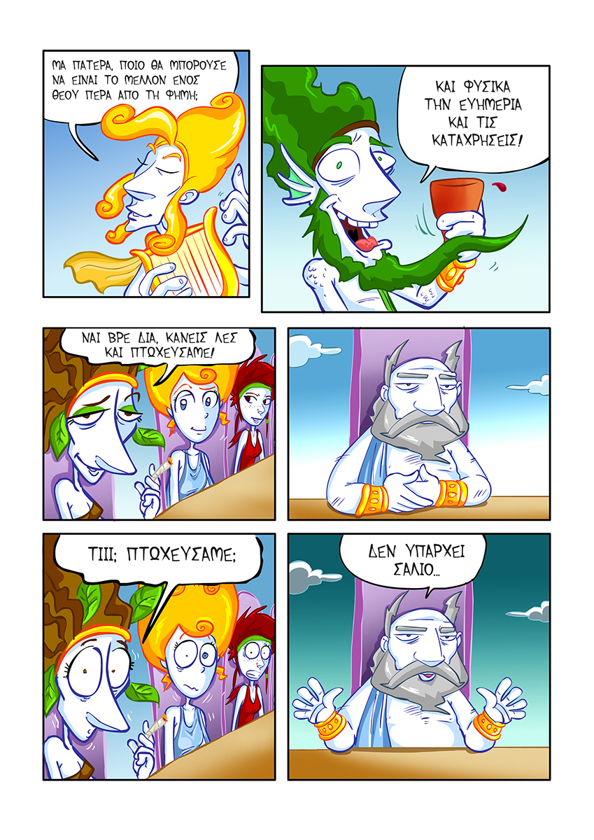 GODS IN CRISIS: (Greek language)Publisher: Webcomics Έγχρωμο, 88 σελίδες. Οι Θεοί του Ολύμπου, με τις καταχρήσεις τους, έχουν αδειάσει το ταμείο. Όλοι έχουν συνεισφέρει σε αυτό: ο Δίας με τις Σειρήνες, η Δήμητρα με τις βιολογικές καλλιέργειες, η Αφροδίτη για να γίνει πιο όμορφη… Έρχεται λοιπόν ο Διεθνής Νομισματικός Θεός (ΔΝΘ), για να τους “βοηθήσει” να βγουν από την κρίση. Στην τελική, αν δεν φτάνουν τα χρήματα, το πολύ πολύ να πουλήσουν την Ακρόπολη. Ο Ερμής ξεκινάει ένα απελπισμένο ταξίδι για να σώσει την Αρχαία Ελλάδα -κατά προτίμηση χωρίς τον ΔΝΘ- και να σώσει τους θεούς από την τρέλα τους, αφού οι θνητοί έχουν αρχίσει να αντιδρούν και να θέλουν να πάρουν την κατάσταση στα χέρια τους… Κυκλοφορεί σε ενημερωμένα βιβλιοπωλεία και κομιξάδικα πανελλαδικά. teaser: |