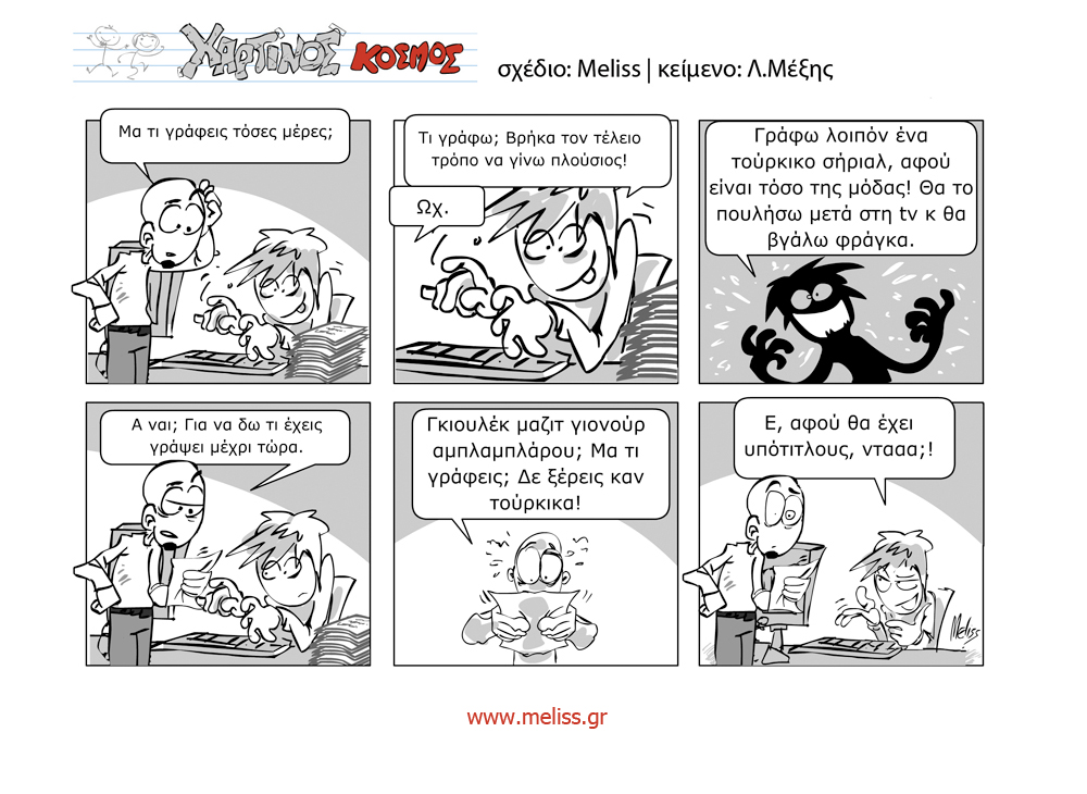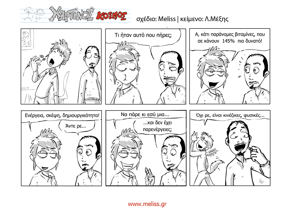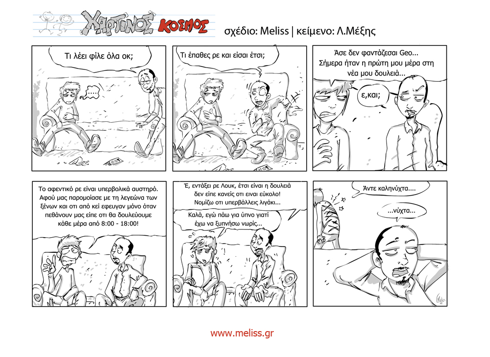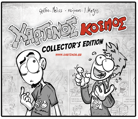 Published by Animatic Vision comics Design: Meliss Language: Greek Xartinos Kosmos is a well known Greek webcomics that we started in 2007 and finished in 2012. Every comic strip was published online, each Monday at www.xartinos.gr. Xartinos Kosmos features the life of 2 friends who live their life through comics, video games and movies and talk about everything with humor. The story is written by Loukas Mexis, and the artwork is made by Meliss. You can find it at Jemma Comics Shop. This album is a collector's edition and it was print in only 400 pieces!! |