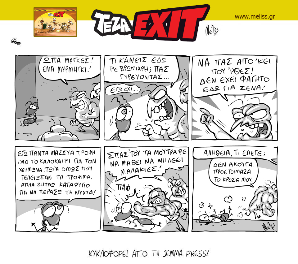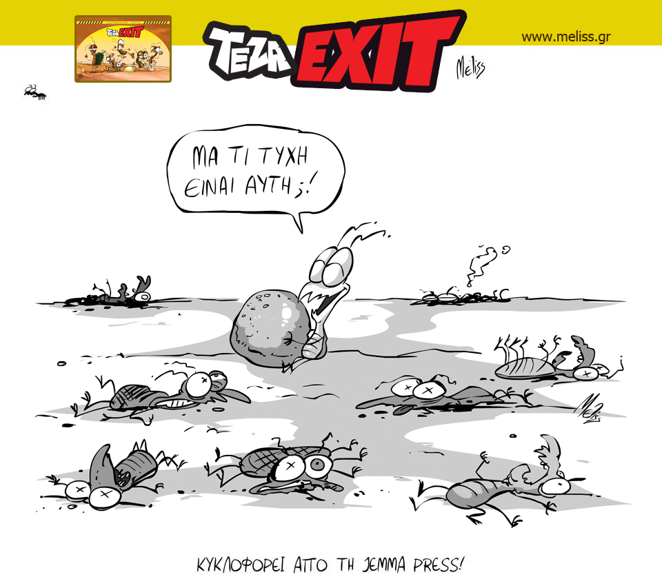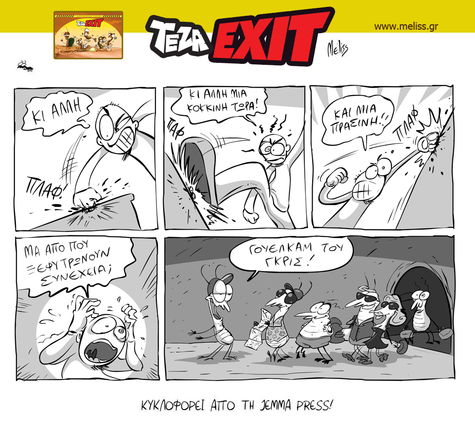 Raid Exit RAID EXIT Story: Meliss Publisher: Jemma Press Language: Greek The roaches try to find a way out from the crisis and misery but they also try to see what is worth more, immigrate or stay and fight? 1st edition (2013) buy it