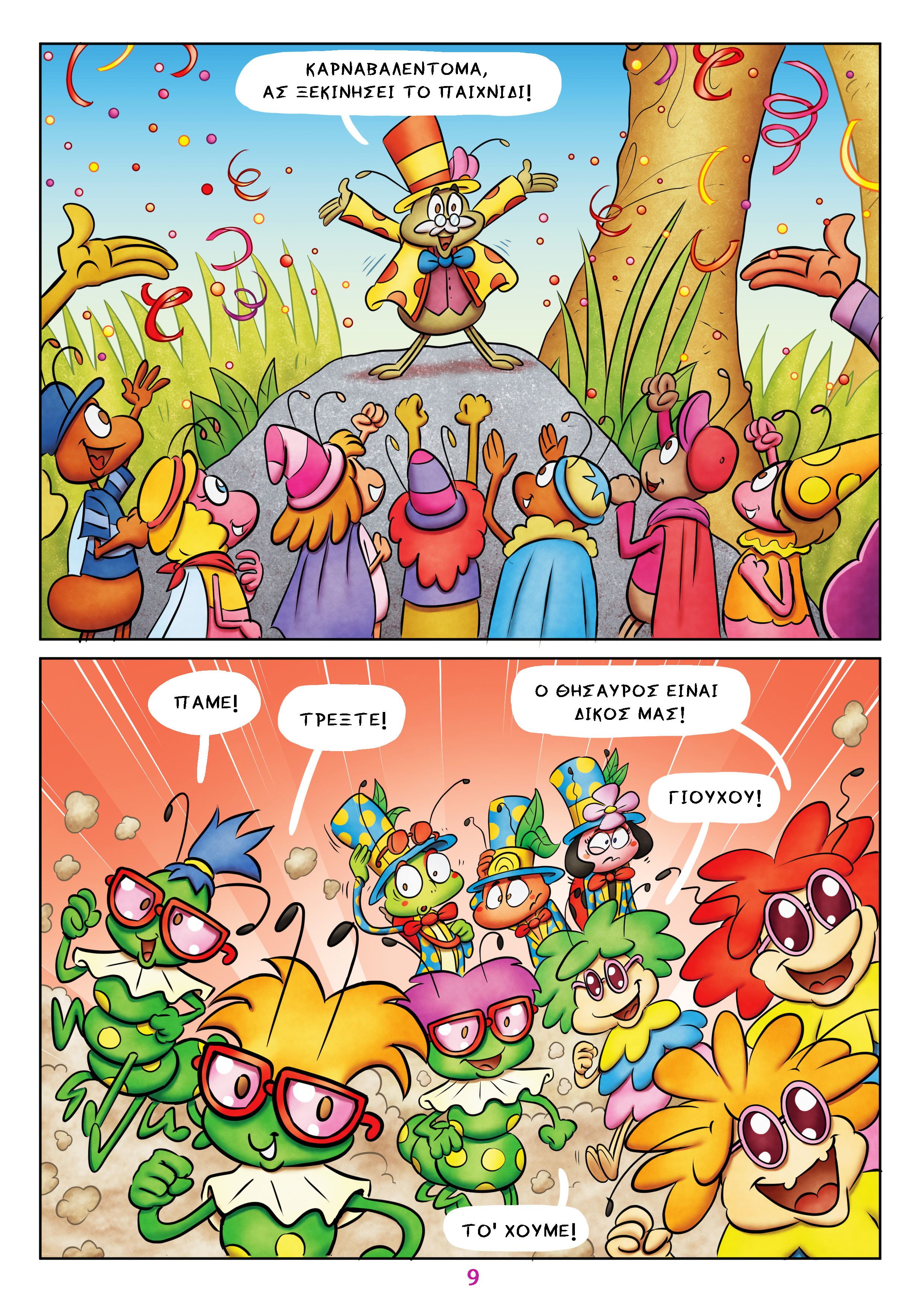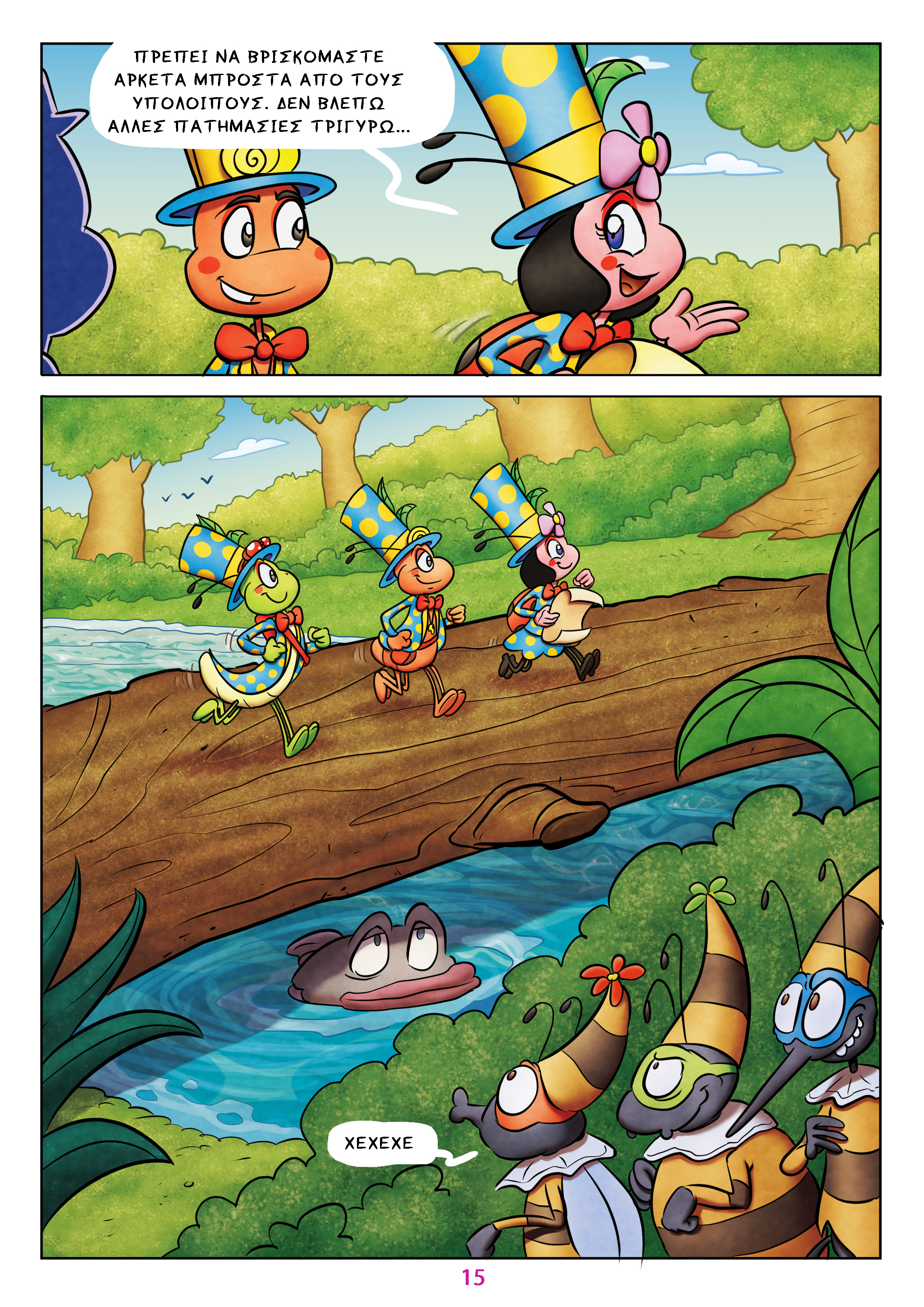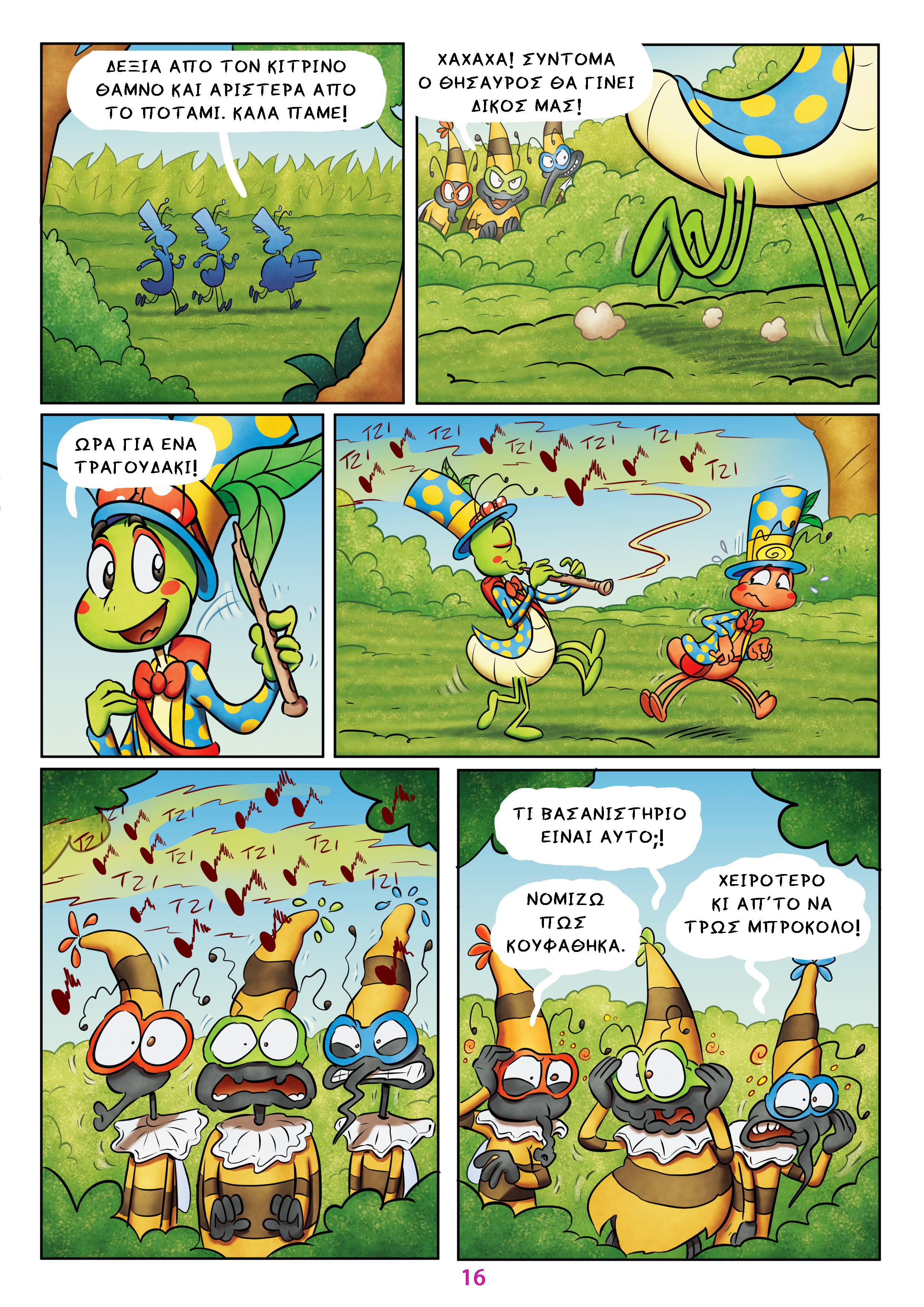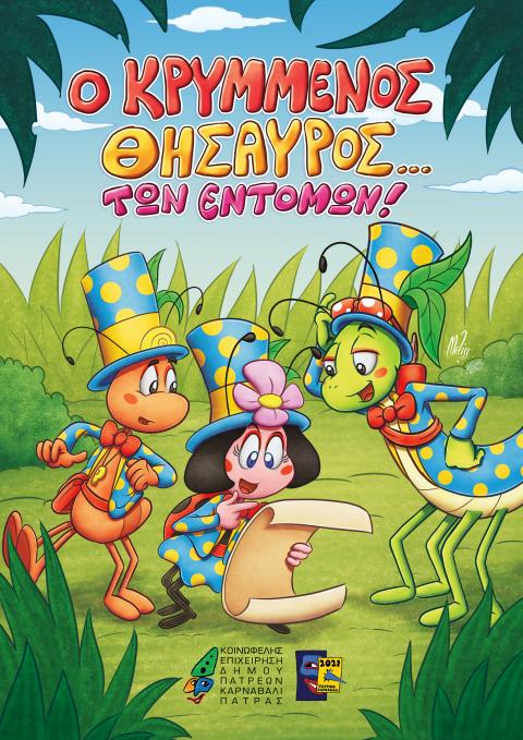 A kids comics I did for Patras digital carnival festival 2021, featuring the kid's festival maskot and his friends. The Cicada of the Carnival of the Little Ones returns and not alone. He comes with his company, Mermigas and Paschalitsa. The three of them will start a beautiful journey looking for the Hidden Insect Treasure. Every year, forest insects gather to celebrate the carnival, dressed in the most bizarre, funny costumes and play the game of hidden treasure. Riddles, hidden, rare objects and difficult tests await them. They will make it; Follow the heroes, Tzitzikas, Mermigas and Paschalitsa in a fantastic adventure full of hidden paths and help them find the treasure step by step! "